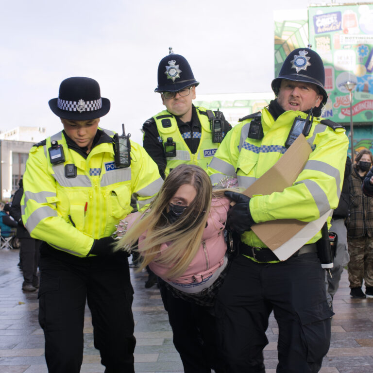 Photographs of a protest outside Nottingham City Library, 18th February 2025, where approximately 20 people held up signs saying “I Oppose Genocide, I Support Palestine Action”. All were subsequently arrested by the police.